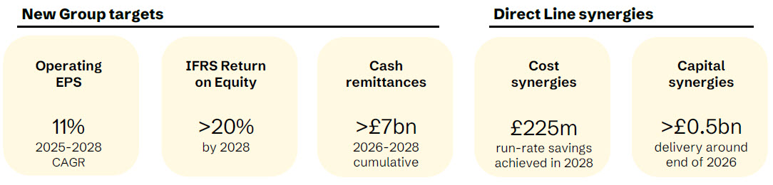 - Expecting to deliver £2bn operating profit and £1.8bn SII Operating Own Funds Generation targets one year early, driven by exceptional performance across the Group and before any Direct Line contribution. We expect full year 2025 Group operating profit to be ~£2.2bn, including ~£0.15bn from Direct Line.